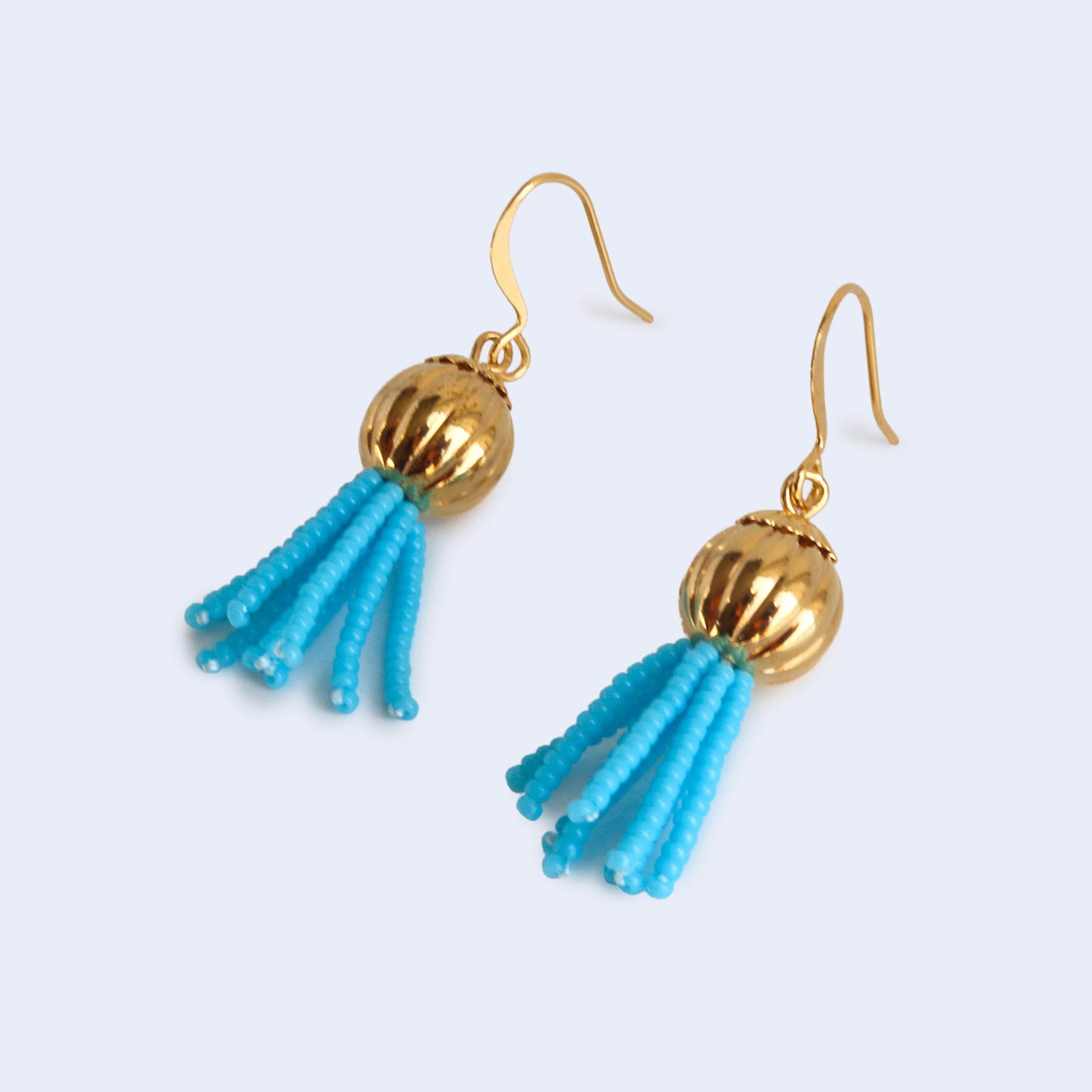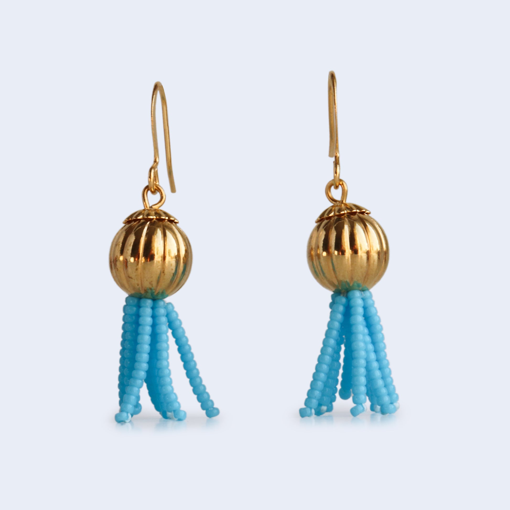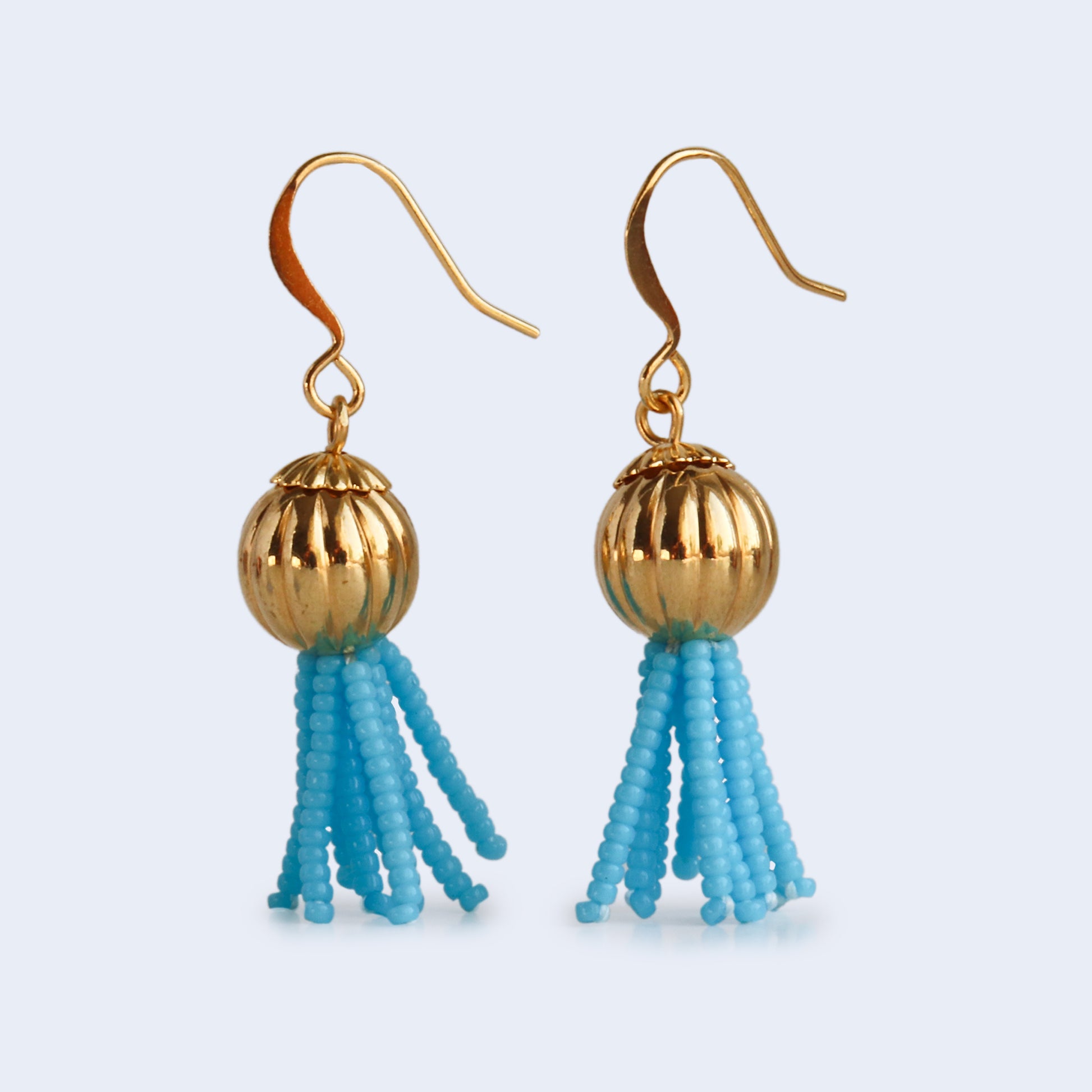 Crafted from gold-plated brass, these earrings feature a captivating barrel-shaped bead. Suspended from the bead is a cascade of delightful tassels, gracefully swaying with every movement. Whether you're heading out for a night of dancing or just want to bring some fun to your day, they are lightweight and comfy.