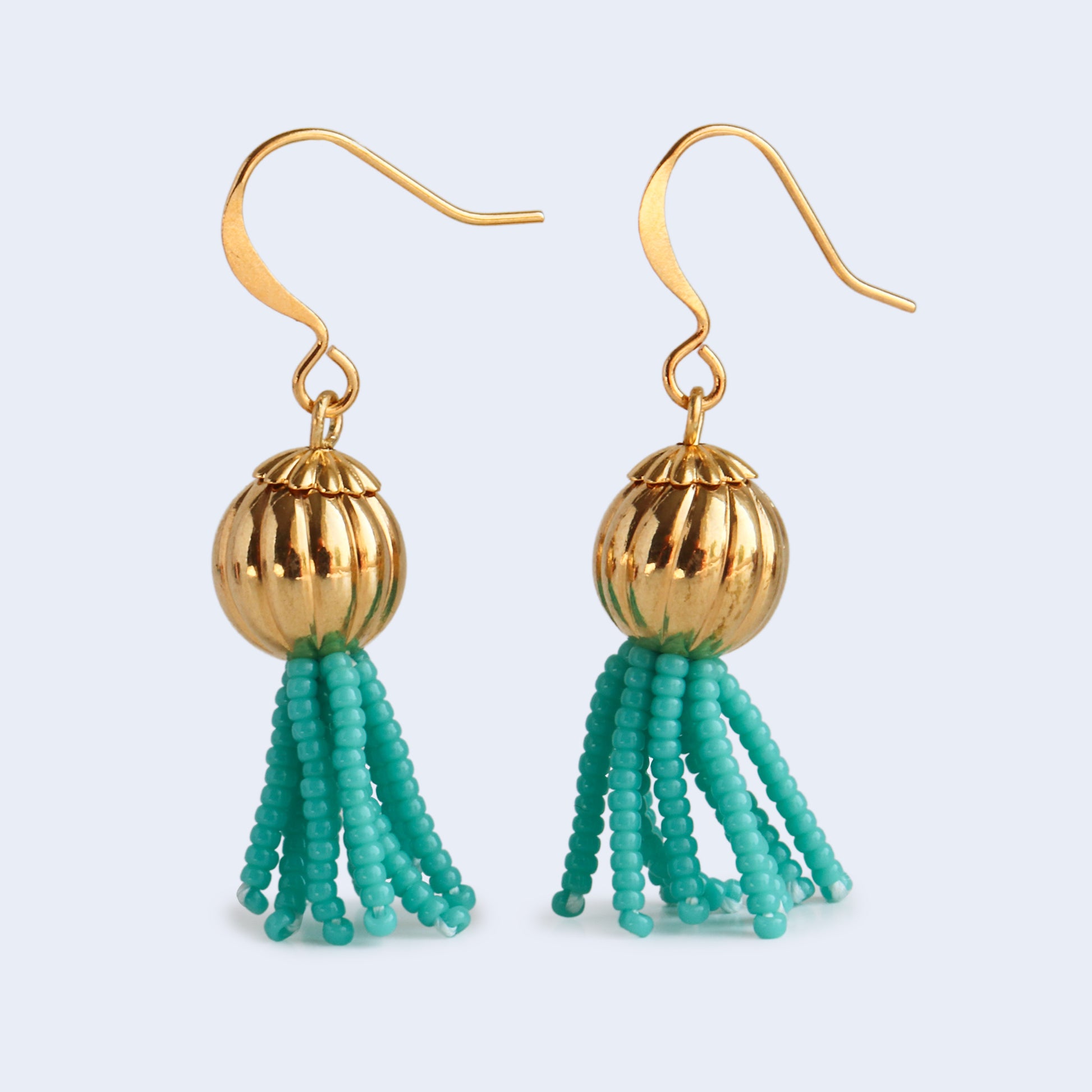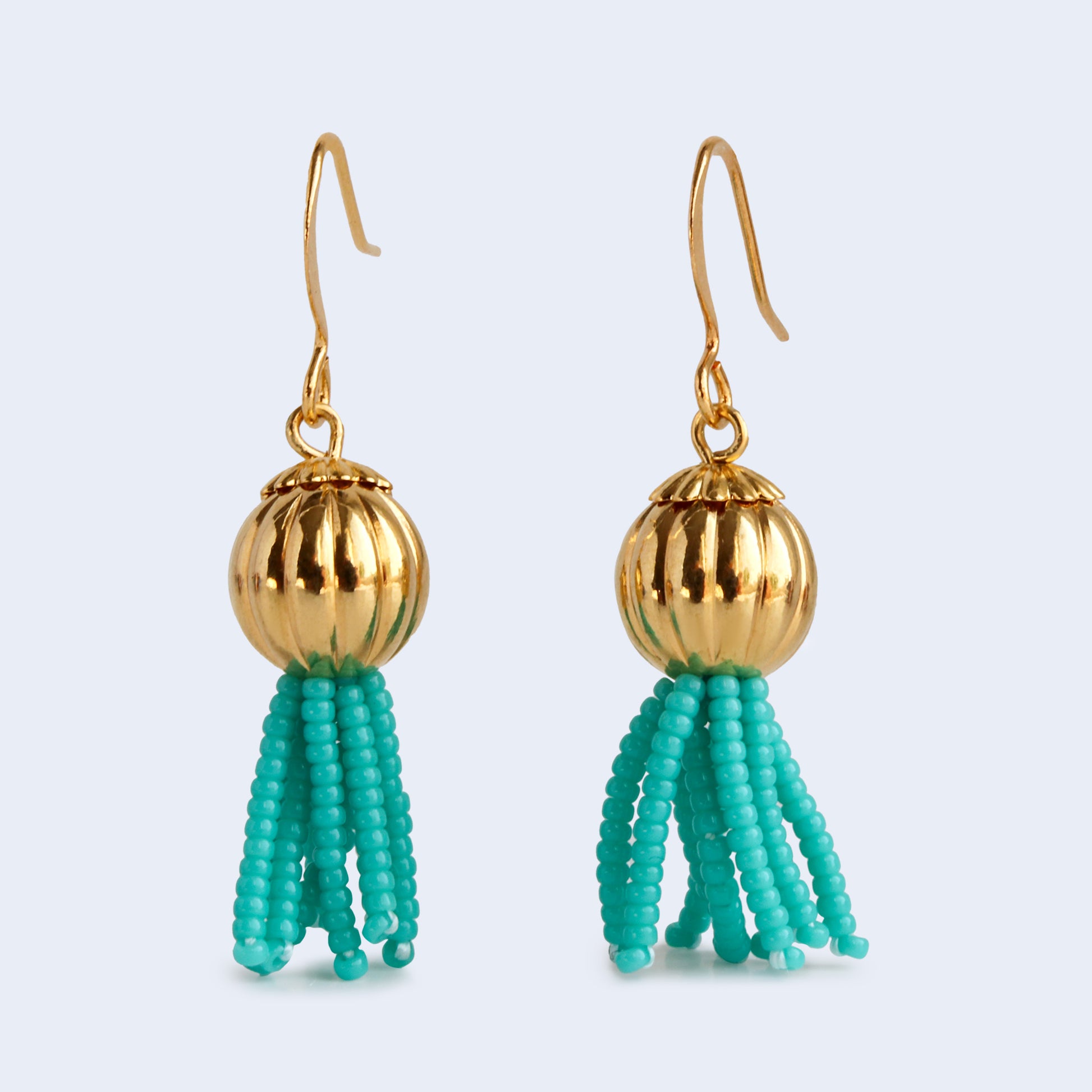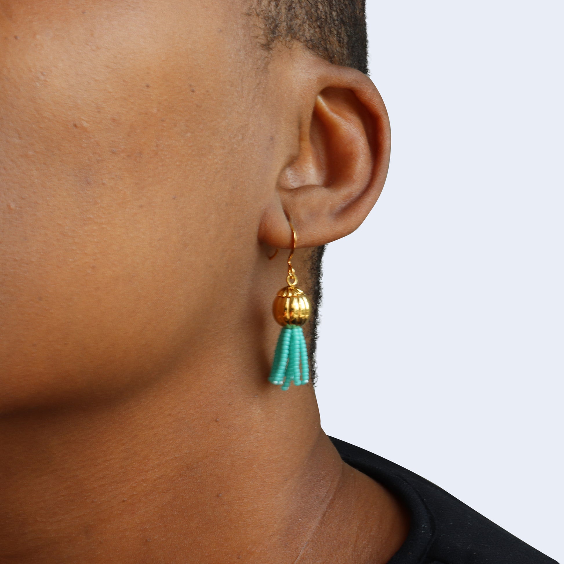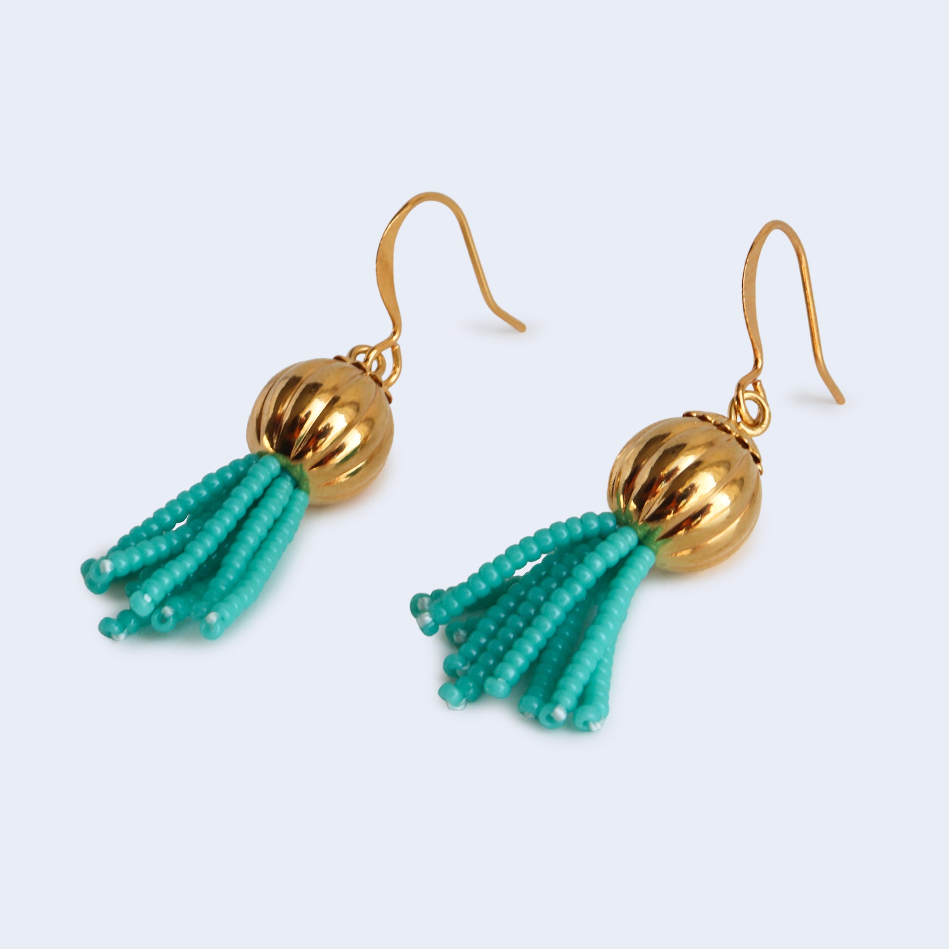 Crafted from gold-plated brass, these earrings feature a captivating barrel-shaped bead. Suspended from the bead is a cascade of delightful tassels, gracefully swaying with every movement. Whether you're heading out for a night of dancing or just want to bring some fun to your day, they are lightweight and comfy.